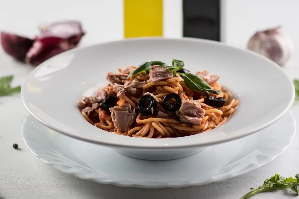 Ingrediente: 430 g (spaghete, sos de roșii, măsline, ton, sare, piper, pătrunjel)